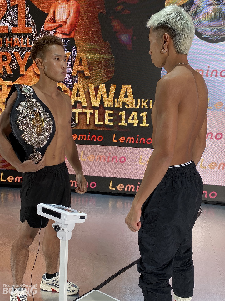 対する津川は、若干オーバーしたが、すぐにパンツを脱ぎネックレスを外して再度、秤の乗るとリミットの55.3sを計測した。津川は「石井選手は同世代で意識していた選手。一度悔しい思いをしているので、明日はその気持ちをぶつける」と、ベルト奪取に気持ちを高めた。