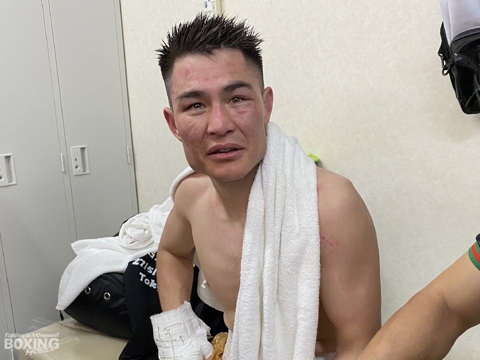 圧巻の内容を見せた宇津木は、「相手のジャブが予想以上に伸びてきて硬かった。12ラウンドある中で、後半に倒せたらと思っていた。ディフェンス面を強化してきたが、(パンチを)もらってしまった。自己採点は50点」と、圧勝劇にも気を緩めることはなかった。
