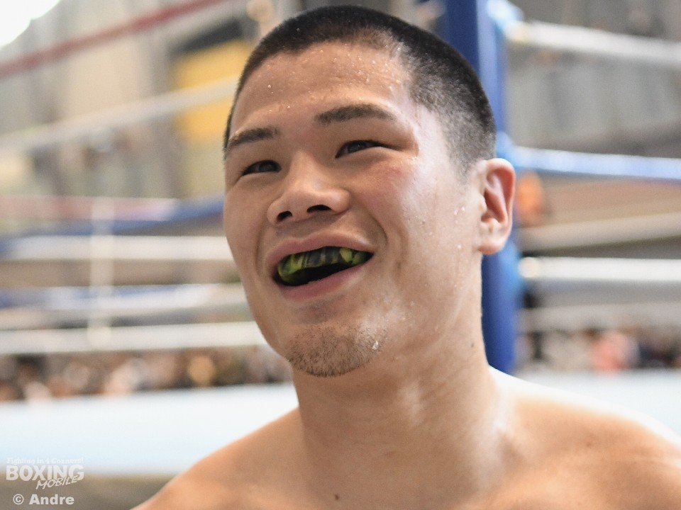 公開プロテストのスパーリングパートナーを務めた前日本フェザー級王者の坂晃典(仲里)は「(打たれた)僕の姿をみたらわかるように、良い選手でした。今後がたのしみですね」と、笑顔で語った。