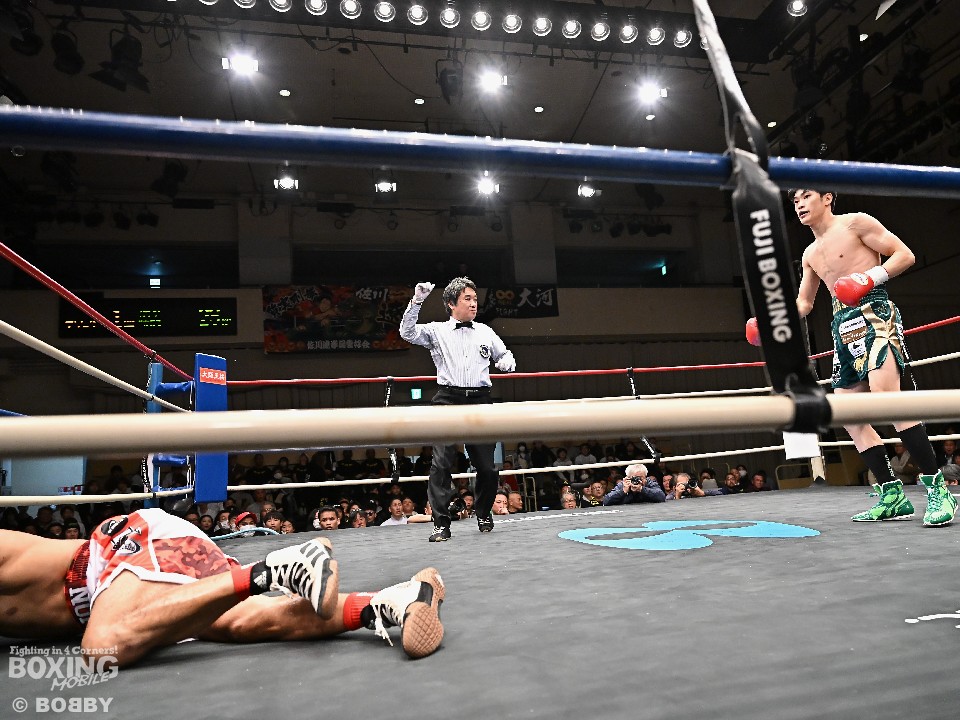 ジャブで距離を測りながら、慎重な試合運びを見せていた佐川だが、ドンピシャのタイミングの右ストレートでダウンを演出。エストラーダに10カウントを聞かせた。1年2ヶ月ぶりの再起戦に臨んだ佐川が完全復活をアピールした。