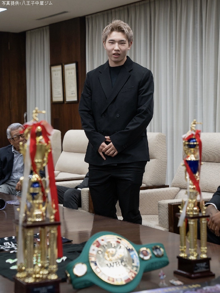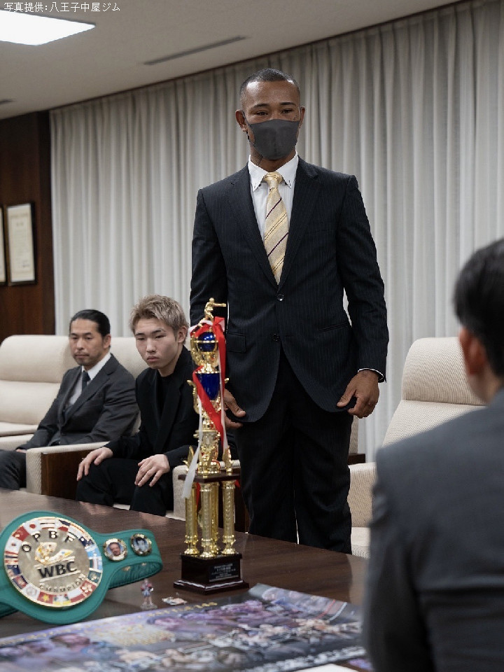八王子中屋ジム所属の佐々木尽(24)、ワチュク・ナァツ(28)、佐々木革(20)の3選手が10日、八王子市役所を訪れ、初宿和夫市長に表敬訪問を行った。