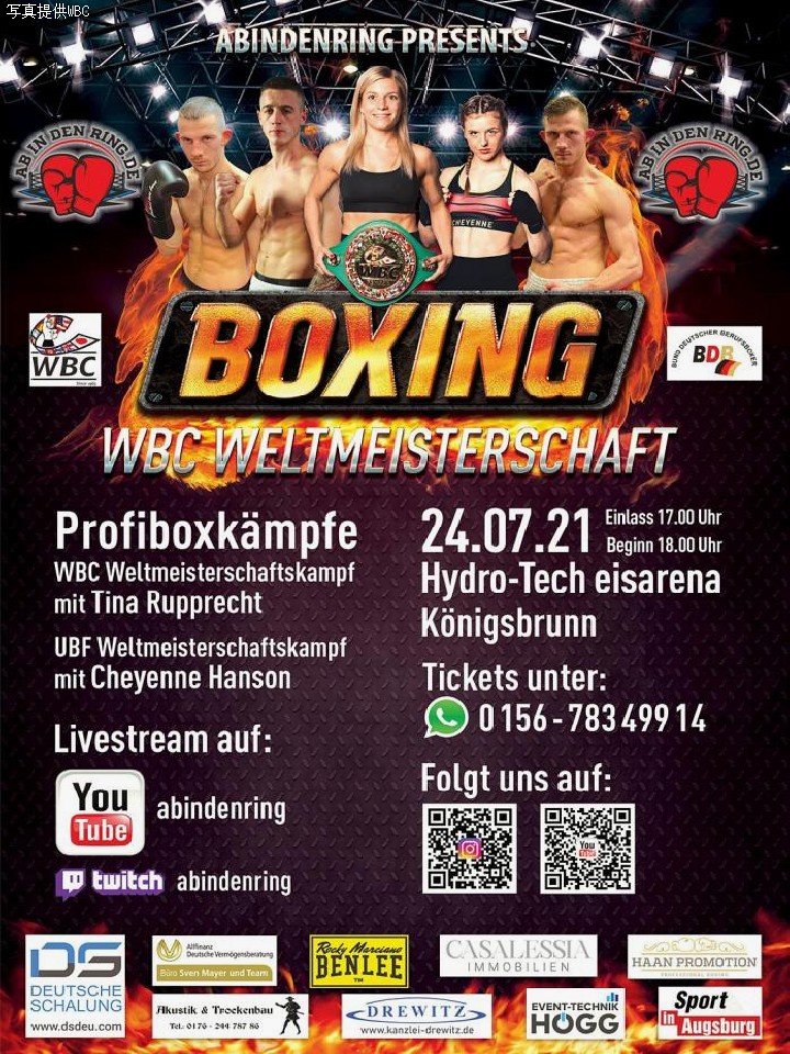 WBC女子世界ミニマム級チャンピオンのティナ・ルプレヒト(28=ドイツ)が日本時間の7月24日(土)、ドイツのアウグスブルク南部のケーニッヒスブルンで防衛戦を迎える。