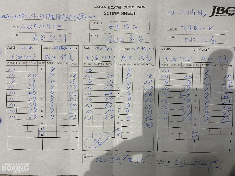 WBA(世界ボクシング協会)女子ライトフライ級挑戦者決定戦が9日、後楽園ホールで開催された「オーバーヒート・ボクサーズナイト」のメインイベントで行われ、元女子世界2階級制覇王者の天海ツナミ(38=山木)とOPBF東洋太平洋女子同級王者の成田佑美(33=姫路木下)が、世界挑戦権を懸けて争った。