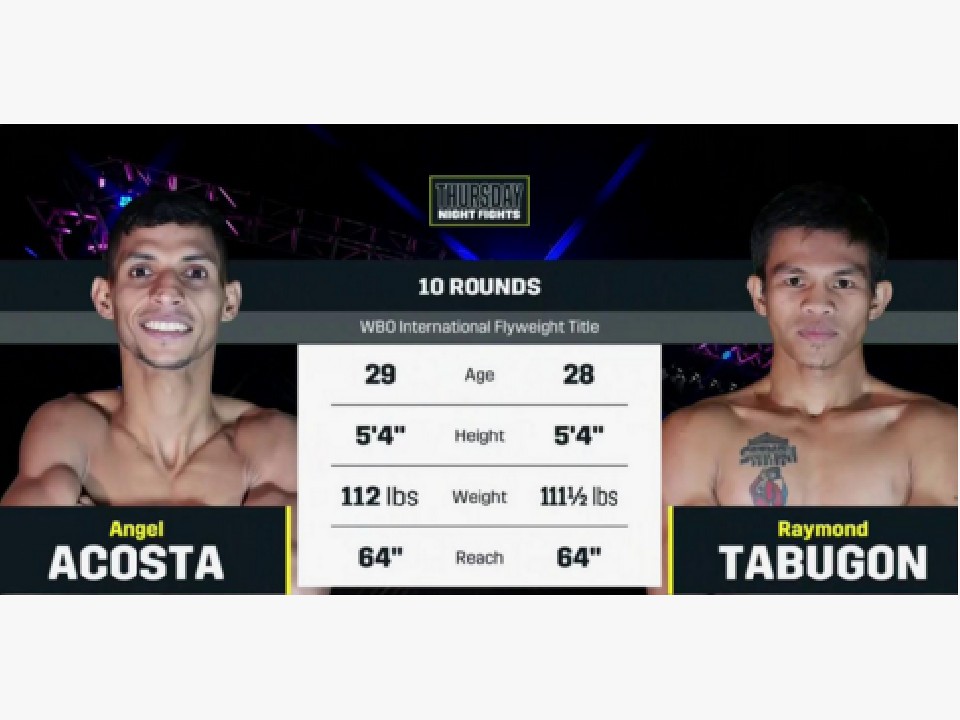 空位のWBOインターナショナル・フライ級王座決定戦で再起戦となった前王者アコスタは、ディフェンスの甘さにつけ込まれる場面もあったが5回に強打を炸裂。左フックを打ち抜き、タブゴンの腰を落とさせダウンを奪うとそのままフィニッシュ。アコスタが5回1分2秒TKO勝利でWBOインターナショナル王座を獲得し再起に成功した。WBO世界フライ級王者の田中恒成(畑中)と、フライ級でのリベンジ戦を望んだアコスタの戦績は23戦21勝(21KO)2敗、敗れたタブゴンは34戦22勝(11KO)11敗1分けとなった。