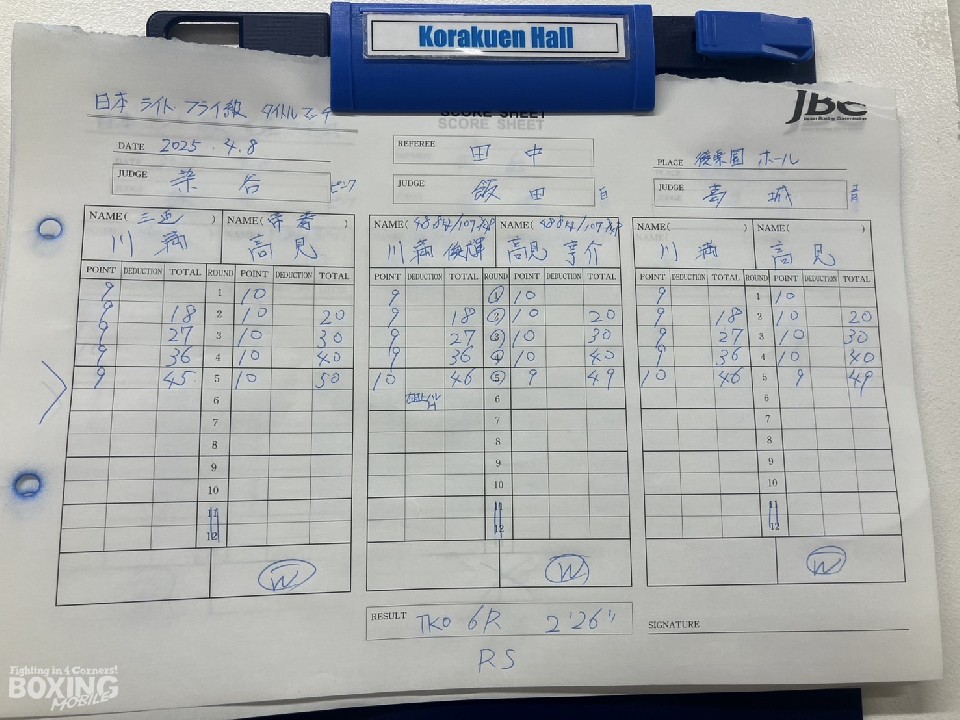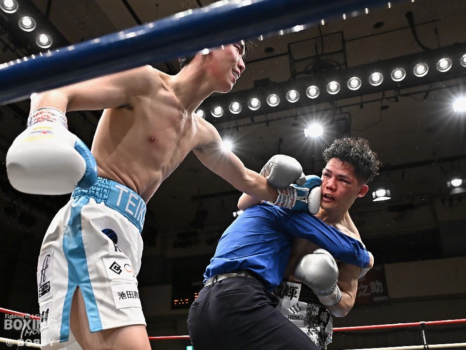 頭を振りながら左ボディを狙う川満に対し、高見は右ショート、左フックを好打。2回以降、高見は足を使いながらジャブを効果的に決めると、折を見て左フック、左ボディでダメージを与えた。プレスを強めた川満だが、高見は冷静に対応し、シャープな左を軸にペースを維持。前半終了時の公開採点でリードした高見は、6回に一気にスパート。手が出なくなった川満を見て、レフェリーが試合をストップした。