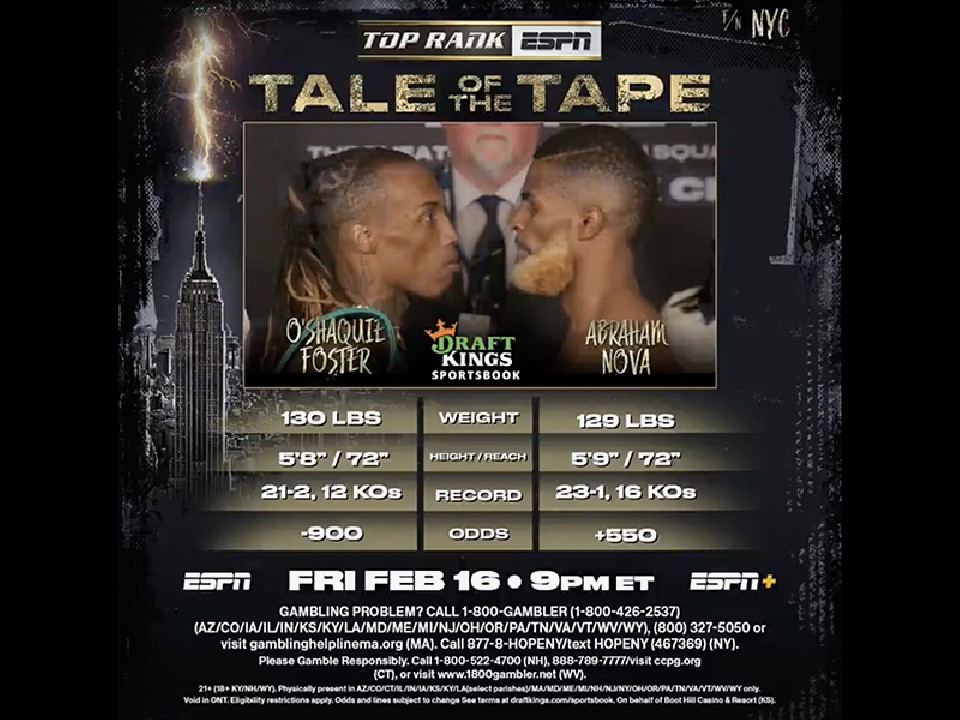 WBC(世界ボクシング評議会)スーパーフェザー級王者のオーシャキール・フォスター(30=米)が16日(日本時間17日)、同級12位のアブラハム・ノバ(30=米)を相手に、米国・ニューヨーク・マジソン・スクエア・ガーデン・シアターで2度目の防衛戦に臨む。現地時間の15日、前日計量が行われた。