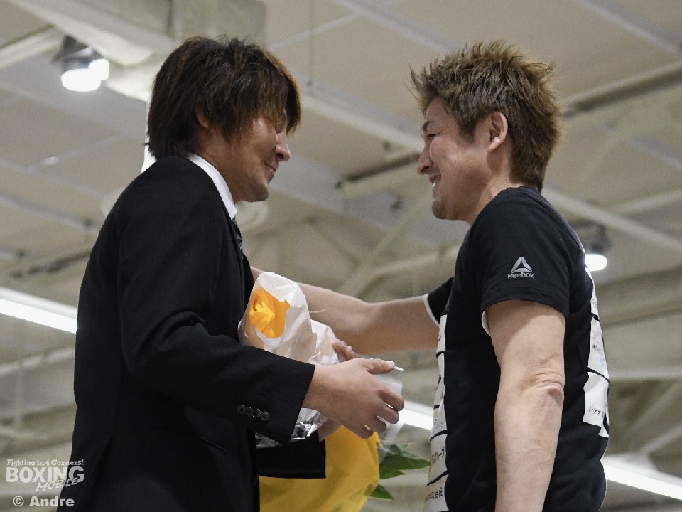 菊地は挨拶後、二人三脚で真正ジム創世記を支えた江藤日出典トレーナー兼会長代行から花束が贈られた。江藤トレーナーは「えっと、コメントできません…。泣いちゃいそうで」と目に涙を浮かべ言葉にならず、菊地との抱擁で労をねぎらった。