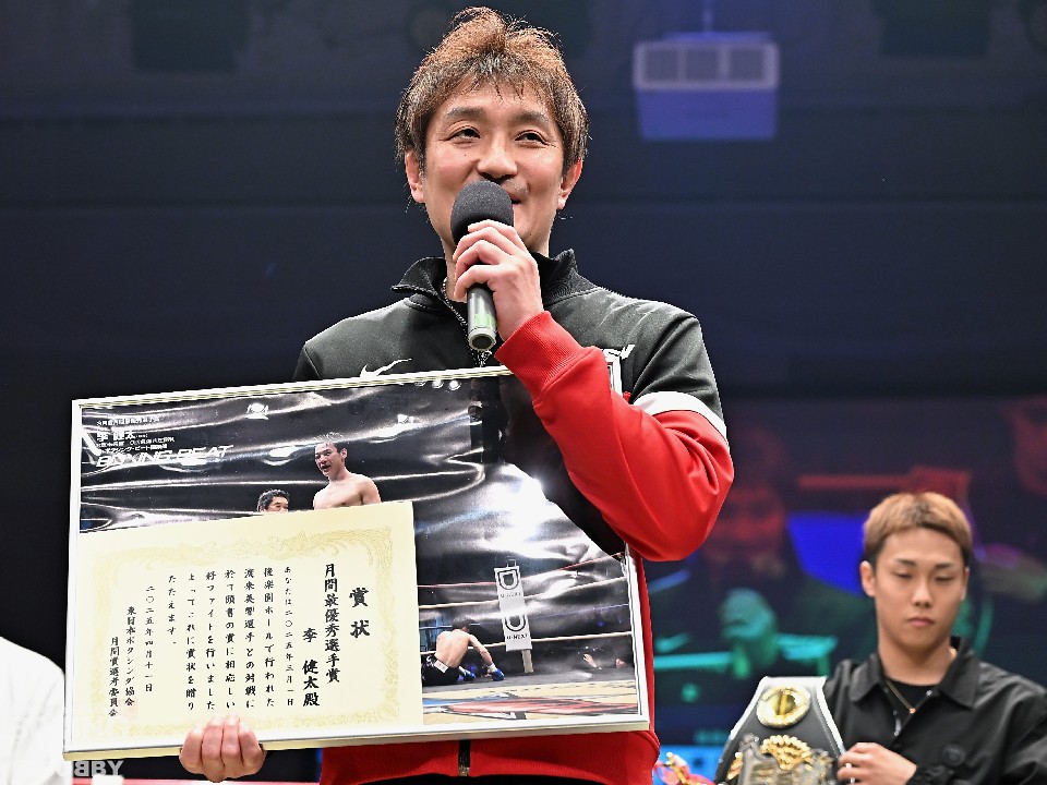 最優秀賞(MVP)に選ばれた日本スーパーライト級王者の李健太(29=帝拳)に代わって、表彰式に出席した大和心トレーナーは、「次も、より良い試合をする」と、準備を進めていることを明かした。
