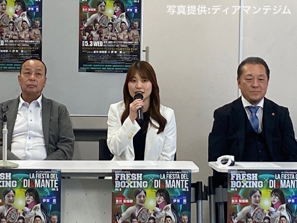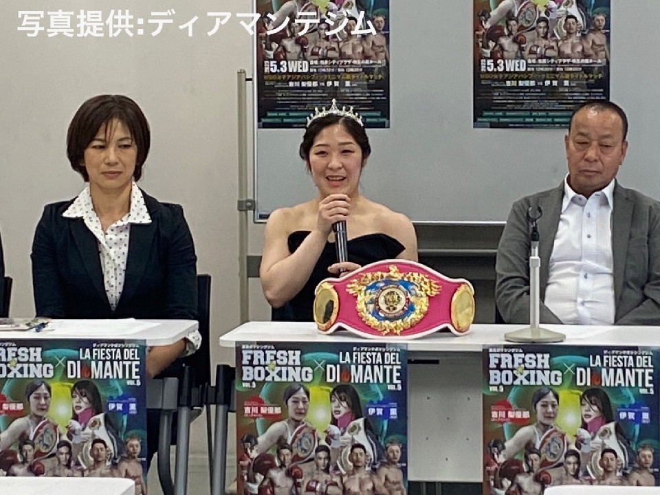 ディアマンテジムは3日、大阪堺市内のジムで記者会見を開き、WBOアジアパシフィック女子ミニマム級タイトルマッチ、王者の吉川梨優那(21=ディアマンテ)vs挑戦者の伊賀薫(30=真正)戦を発表した。