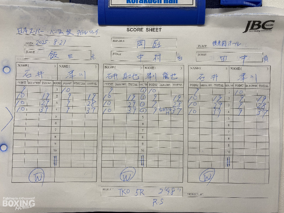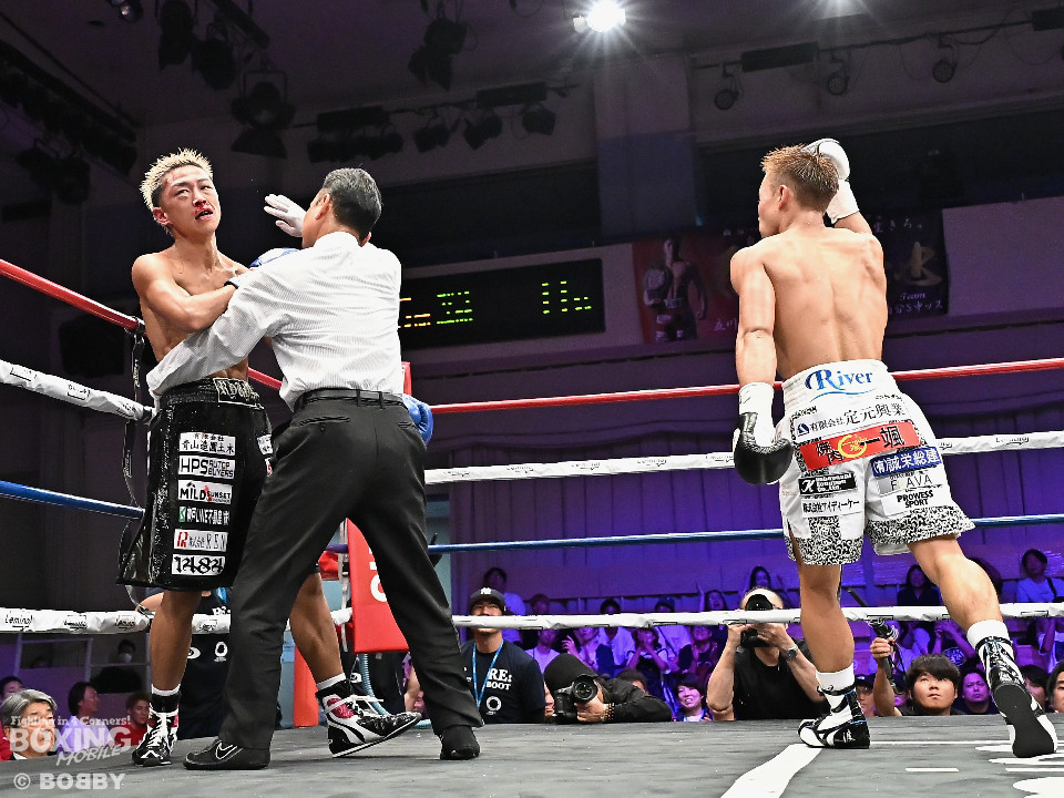 ジャブの差し合いから、津川が距離を詰めて積極的な攻撃を展開。2回、石井は持ち前のフィジカルの強さを活かし、ジャブから左フックを好打。その後も石井が力強いコンビネーションで、ジワリジワリと攻め立てた。劣勢の津川は、5回にワンツー連打で反撃するが、石井はブロックで決定打を回避。攻撃の手を緩めず攻め立てると、ダメージの深さを考慮したレフェリーが試合をストップした。