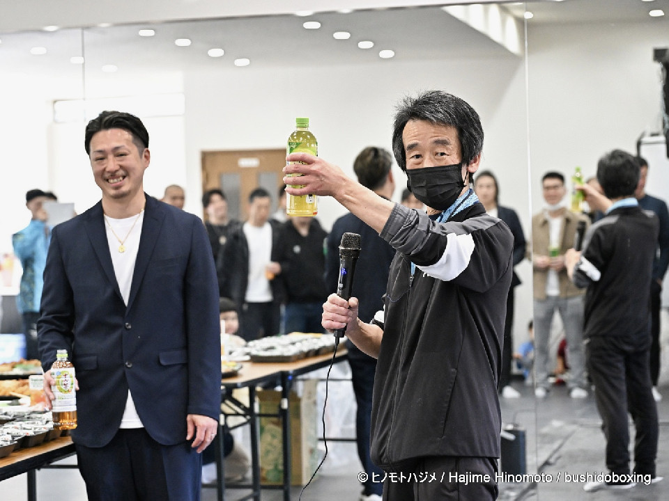 パーティーには、日本スーパーフライ級王者の山口仁也(26=三迫)、元OPBF東洋太平洋スーパーライト級王者の近藤明広(40=一力)、日本スーパーウェルター級7位の加藤寿(40=熊谷コサカ)、元日本ランカーの田之岡条(32=小熊)、アマチュア全国選抜大会優勝の金子暖東(18)らが駆け付け、花を添えた。