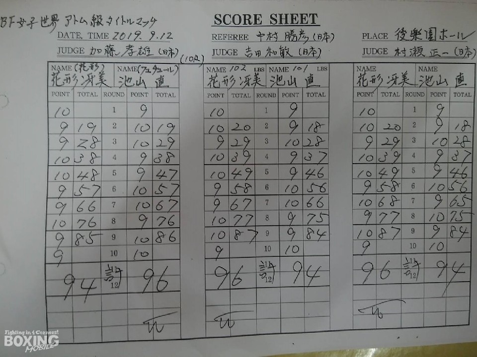 IBF(国際ボクシング連盟)女子アトム級タイトルマッチが11日に後楽園ホールで開催された「Victoriva.5」のメインイベントで行われ、王者の花形冴美(34=花形)と挑戦者で前WBO(世界ボクシング機構)女子同級王者の池山直(49=フュチュール)が拳を交えた。