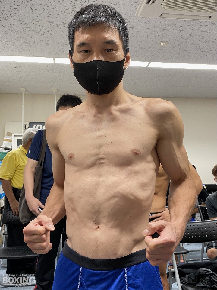 先に秤に乗った堀川は、ライトフライ級リミットを300g下回る48.6kgでクリアした。「こんなに試合間隔が空いたのは初めて」と2年ぶりのリングとなるが、「久しぶりの試合だが、順調に落ちた」と仕上がりの良さを強調した。