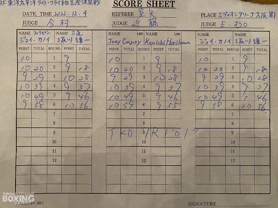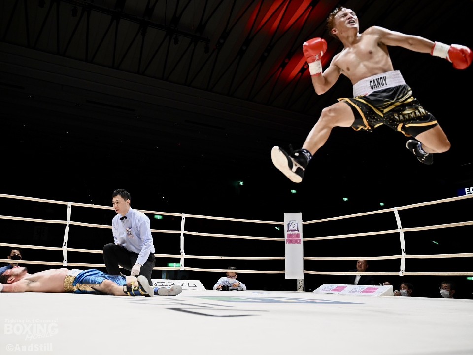 サウスポー・キャノイの強打が爆発した。2回、右フックでガクッと堀川の腰を沈めさせると、コーナーに詰めて連打で攻勢。堀川は、ガードしてピンチをしのいだ。3回、堀川は右フックから左ボディを好打し反撃するが、キャノイは左ストレートをねじ込み揺らず。4ラウンド終了時の公開採点は、39-37×3でキャノイがリード。堀川はボディにコツコツとパンチを当てて、体力を削り積極的な攻撃。しかし、キャノイは7回、ダイナミックな右アッパーを突き上げて、ダメージを与えると、最後は左アッパーで痛烈なダウンを演出。キャンバスに大の字になった堀川を見て、レフェリーはノーカウントで試合をストップした。