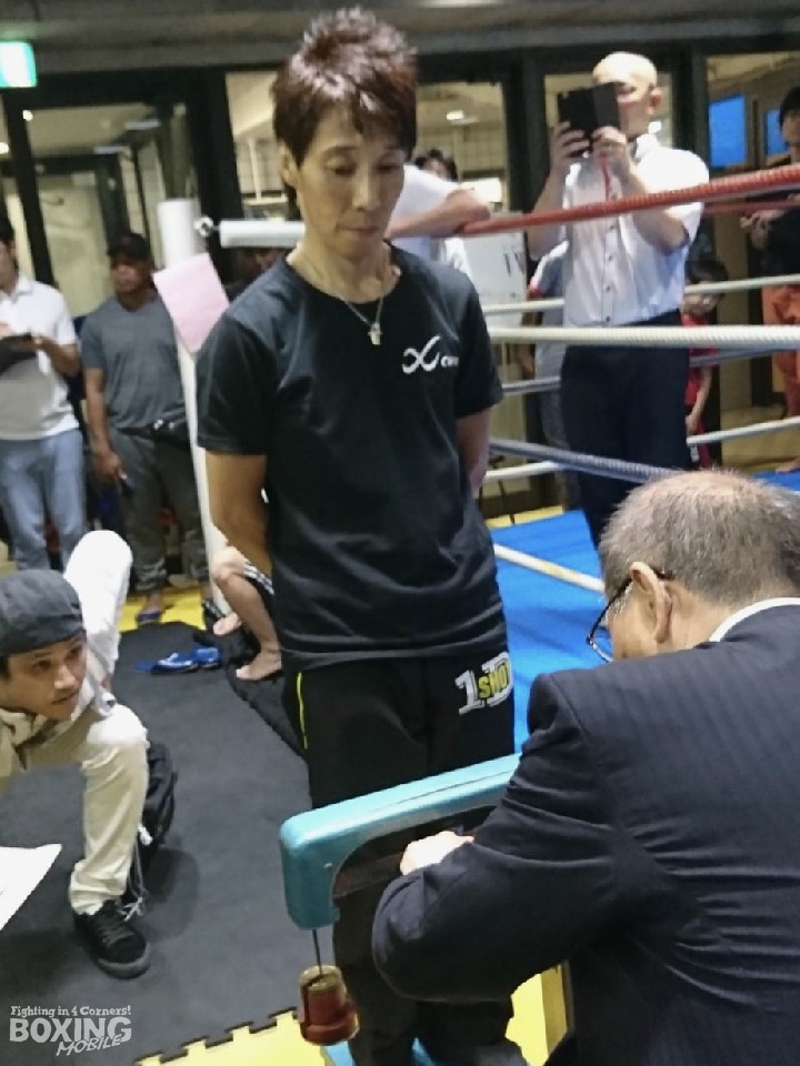 先に秤に乗ったチャンピオンの池山は45.8kgの400gアンダーで余裕のパス。「明日は皆さんが元気になるような試合をします。応援よろしくお願いします」と落ち着いて話し、計量後はうどんと玉子丼に舌鼓を打った。