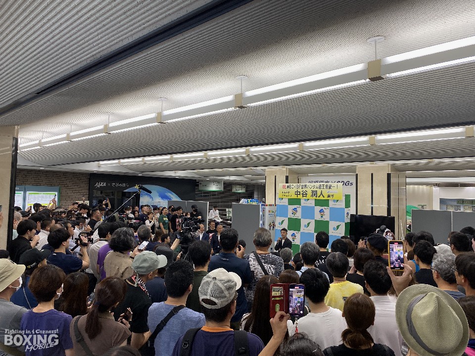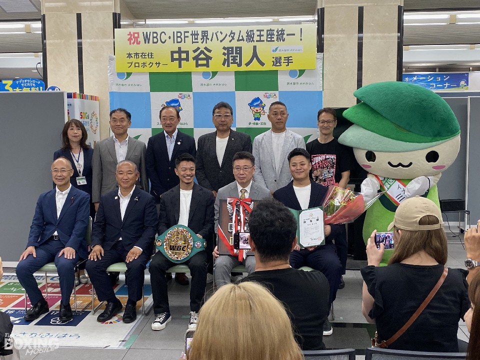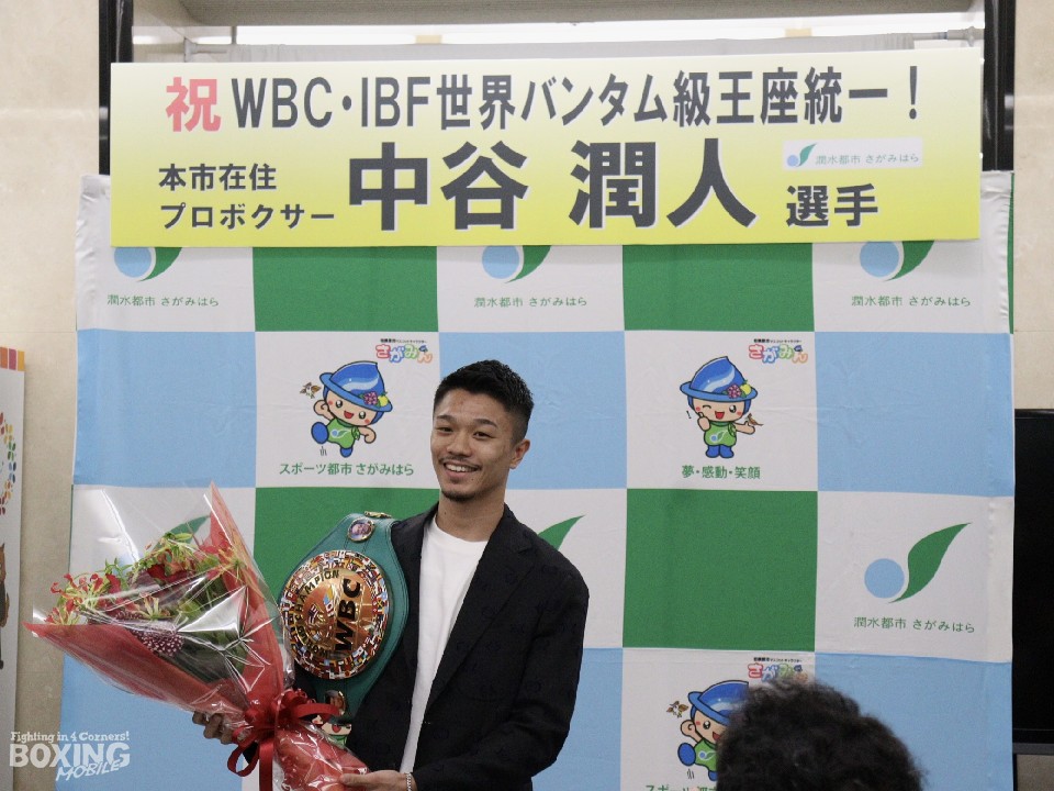 WBC・IBF世界バンタム級の2団体王座統一に成功した中谷潤人(27=M.T)が5日、相模原市役所を訪れ、200人以上の地元ファンに勝利を報告した。一階のエントランスホールは、ジュントコールに包まれた。