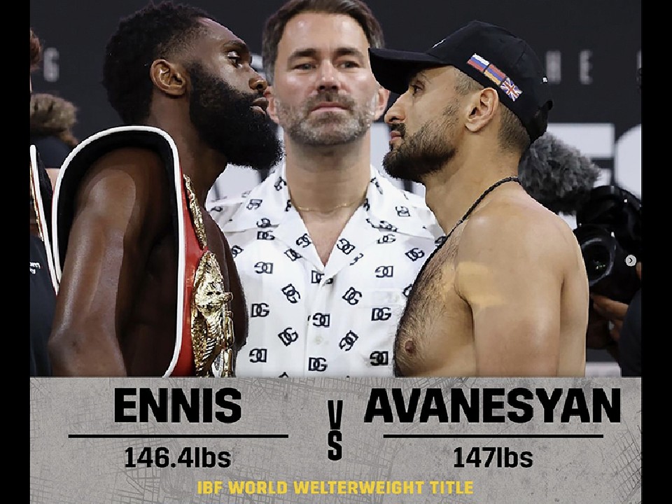 IBF(国際ボクシング連盟)ウェルター級王者ジャロン”ブーツ”エニス(27=米)が米国時間の12日、ペンシルバニア州フィラデルフィアで行われる凱旋試合の前日計量に臨み、同級13位の挑戦者で、元WBA同級王者のダビド・アバネシアン(35=ロシア)と顔を合わせた。