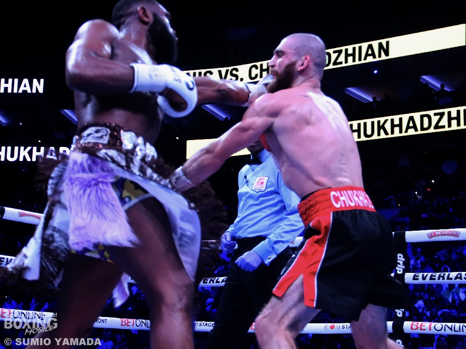 スイッチヒッターの王者エニスは、右構えからスタート。挑戦者チュクハジャンは、上半身を振りながら、タイミングを伺い、左フックを当てバランスを崩させた。エニスはスイッチしながらパンチをかわしてヒットを狙うと、チュクハジャンはボディにパンチを集め削りにかかった。すると5回、エニスが左右アッパーを効かせダウンを奪った。その後、揉み合いが多くなると、10回にチュクハジャンがホールドの反則を取られる。試合は最終回まで進むと、打ち気で前に出るエニスに、チュクハジャンも負けじと左右フックで対抗して、終了のゴング。エニスが3-0(119-107、117-109、116-110)の判定で、3度目の防衛に成功した。