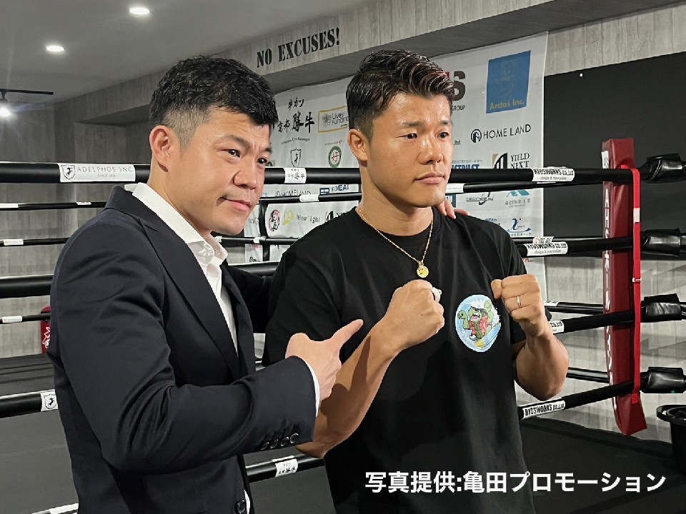 試合発表を受けて和毅は「この試合に勝って、世界王座に挑戦する。それだけです。2023年10月の試合で戦った自分は、別の人間だと思っています。今はあの時とはボクシングスタイルも人間としても全く変わっているし、別人格になっているので、今が本当の和毅(ともき)で、あの時は和毅(かずき)だと思っています」と笑いを交えて話し、「3 月の試合でもボクシングスタイルが変わってきたが、3月よりも今は、より進化したボクシングスタイルになってきていると思うし、スパーリングパートナーも色々なタイプを外国から呼んで、今、親父(亀田史郎トレーナー)と一緒に良いトレーニングができています。次の試合では、より新しい亀田和毅、“シン・トモキ”をお見せできると思います」と、昨年 11月からコンビ再結成となった父・亀田史郎トレーナーとの、現在の充実したトレーニング状況を語った。