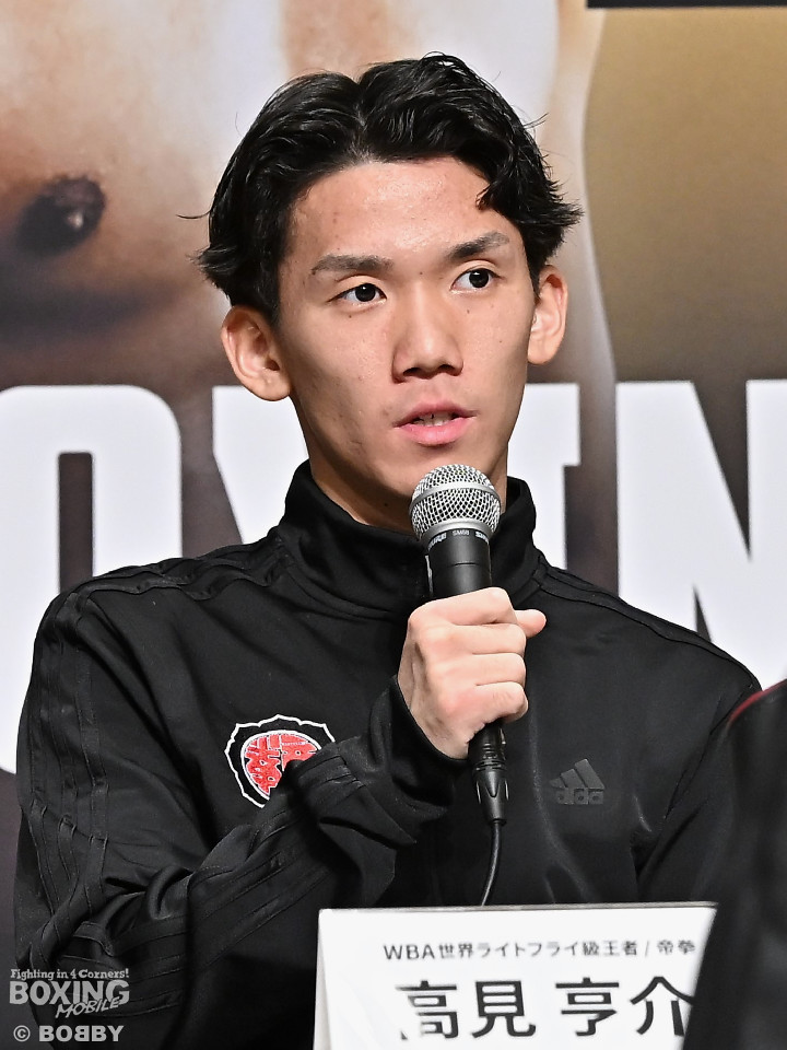 WBA(世界ボクシング協会)・WBO(世界ボクシング機構)ライトフライ級王座統一戦の記者会見が15日、東京ドームホテルで行われ、WBA王者の高見亨介(23=帝拳)とWBO王者レネ・サンティアゴ(33=プエルトリコ)が顔を合わせた。