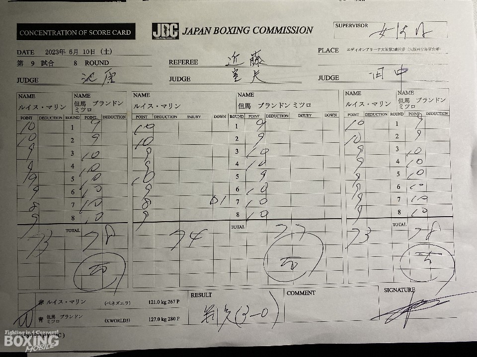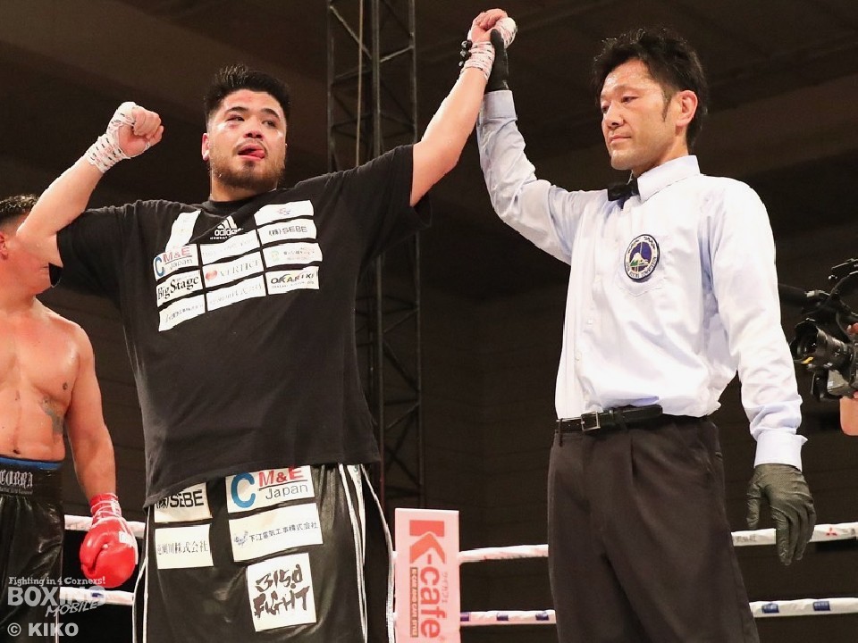 マリンの粘りに手を焼いた但馬だが、しっかりと勝ち切った。序盤は、マリンが左右ボディから左アッパーで、先手を奪うことに成功。しかし、3回になると但馬の左フックが冴えてくる。中盤、但馬は体力の消耗が激しいマリンを攻め立てると、7回に左フックから右の返しを決めて、ダウンを演出。終盤もペースを支配した。