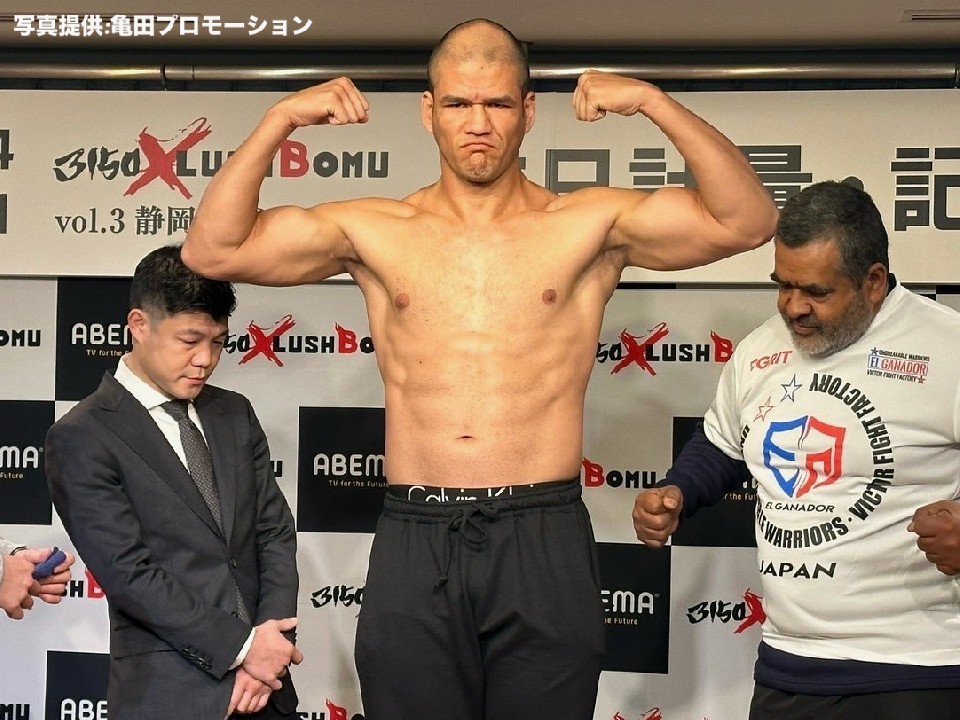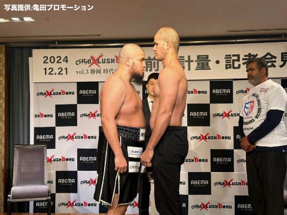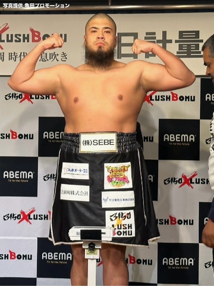 約8ヶ月ぶりのリングに上がる但馬は、120.3kgで計量を終えた。前戦より18.7kg増量して再起戦に臨む。但馬は「ここまでいろいろな気持ちを持って過ごしてきた。応援してくれる人たちのために、強くなった姿を見せる。明日、皆さんが見たいものはわかっている。KOします!」と力強く語った。