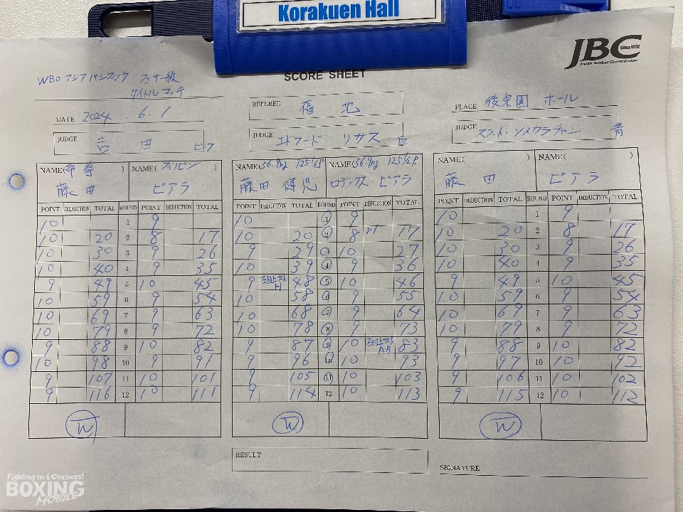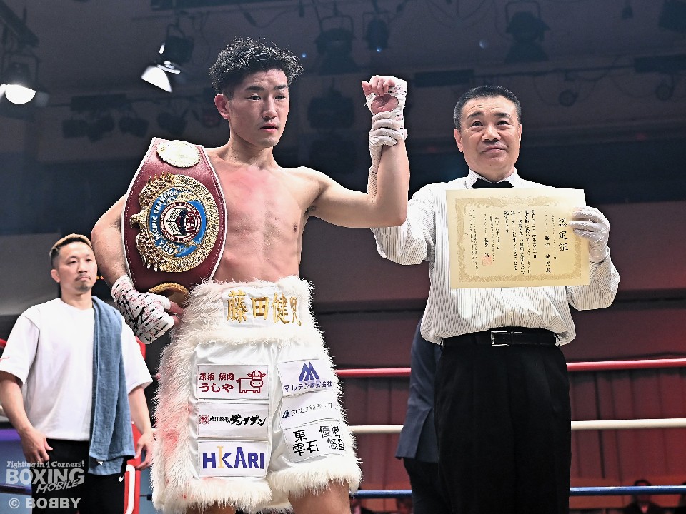 序盤からサウスポー藤田が、左ボディストレートを決めてペースを握ると、2回に左ストレートでダウンを演出。5回にピアラの右オーバーハンドを浴びたが、その後も相手の強打をかわしながら、ボディにパンチを集めてダメージを与えた。KO決着に期待が高まったが、後半、ピアラは右フックで反撃に転じると、ブンブンとパンチを振り回しポイントを挽回。手数が減った藤田は、フットワークを使いながら決定打を避けた。1〜5ポイント差をつけた藤田が初防衛に成功した。