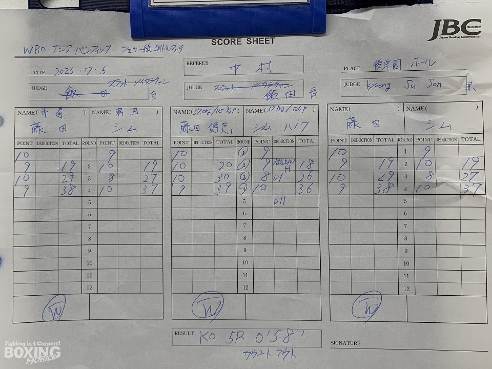 サウスポー同士による一戦は、序盤は藤田が出入りとワンツーで優勢を取るも、シムも左クロスや左ショートを的確に当てて反撃。3回、藤田が左カウンターでダウンを奪い、その後も接近戦やボディ攻撃でシムにダメージを与えると、5回に右ボディで立て続けに倒して、フィニッシュにつなげた。