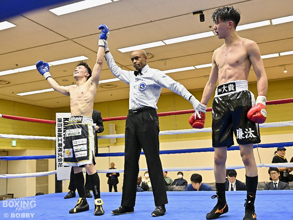 試合の序盤から鋭いワンツーを打ち下ろす倉持に対して、下からコンパクトな左フックと右ストレートで顔面を弾いた小原が、ポイントを稼いで判定勝利を収めた。