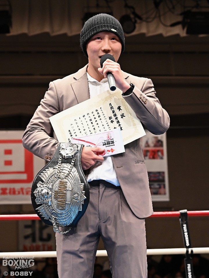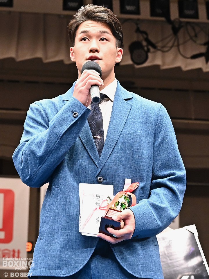 新鋭賞は、日本スーパーライト級3位の渡来美響(25=三迫)が選出された。渡来は「このような賞をいただき光栄です。自分の目標は、一貫して世界チャンピオンになること。世界のトップで活躍しているシャクール(シャクール・スティーブンソン=米)、デービス(ジャーボンタ・デービス=米)、ヘイニー(デビン・ヘイニー=米)、テオフィモ(テオフィモ・ロペス=米)らを倒して世界を獲る。これからも応援よろしくお願いします」と挨拶した。