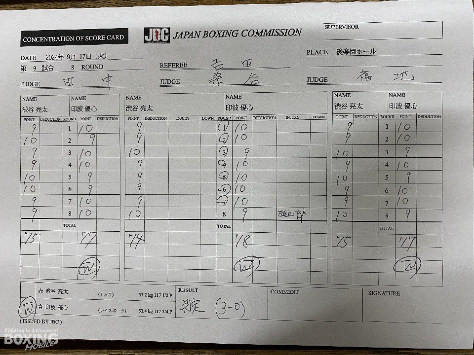 上体を忙しく動かしながらテンポの良さを見せる印波に対し、渋谷はガードを固めながらボディに的を絞った。左ボディを浴びた印波だが、足を使いながらジャブ、左のコンビネーションをヒット。ガードの上からでも豊富な手数で、ジャッジに攻勢をアピールした。7回、印波は回転力を活かした連打で攻勢。8回は、渋谷がショートアッパー、左ボディで盛り返した。2〜4ポイント差をつけた印波が勝利した。