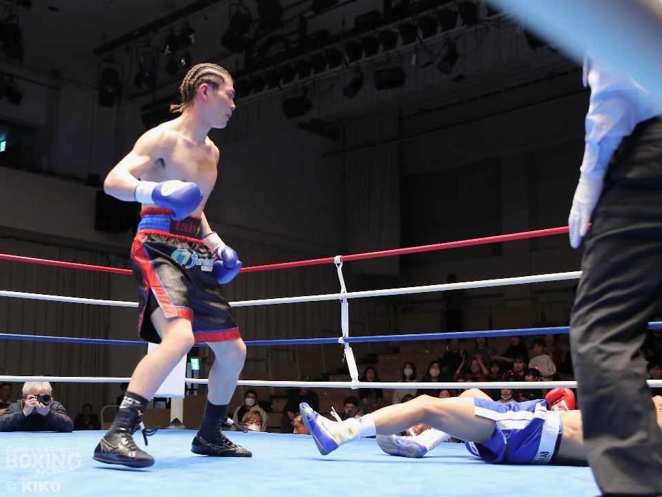 石脇がジャブを上下に散らすと、デスティノも左フックで対抗。ラウンド終盤、石脇は右フックを叩きつけてペースを握った。2回、石脇は左フックでグラつかせると、追撃の左フックでダウンをゲット。ダメージの深さを考慮したレフェリーが試合をストップした。