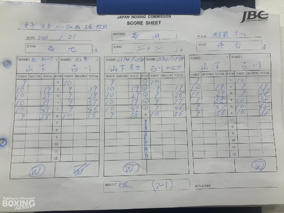 初回は、古川がジャブを突きながら、丁寧なボクシングで先制。しかし、2回になると山下は相手の左を冷静に対応し、ワンツー、左ボディを好打。ジャブを軸に見栄えの良いボクシングでペースを握り続けた。最終6回、古川は回転力を活かした連打で攻め立てたが、山下も負けじと返した。ジャッジ2者の支持を得た山下がベルトを巻いた。