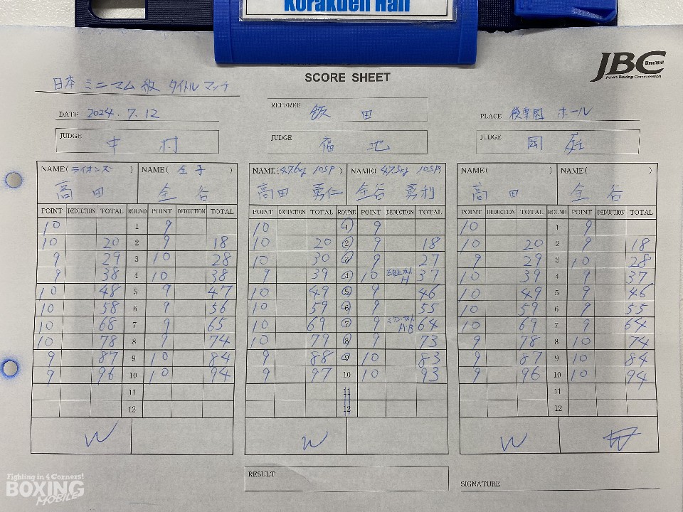 序盤は、高田が右ボディストレート、左ボディを好打し先制。金谷はジャブからワンツーにつなげたが、高田はボディワークでかわすと、右ボディアッパーを突き刺した。前半終了時の公開採点は、48-47×1、49-46×2で高田がリード。6〜7回も高田が要所要所で左ボディを決めて、ポイントを加点した。しかし、金谷は被弾しながらも前に出て、回転力を活かした連打で挽回。9〜10回は激しい打撃戦を繰り広げる中、金谷の有効打が上回った。結果は、前半の貯金を守った高田がV4を達成した。