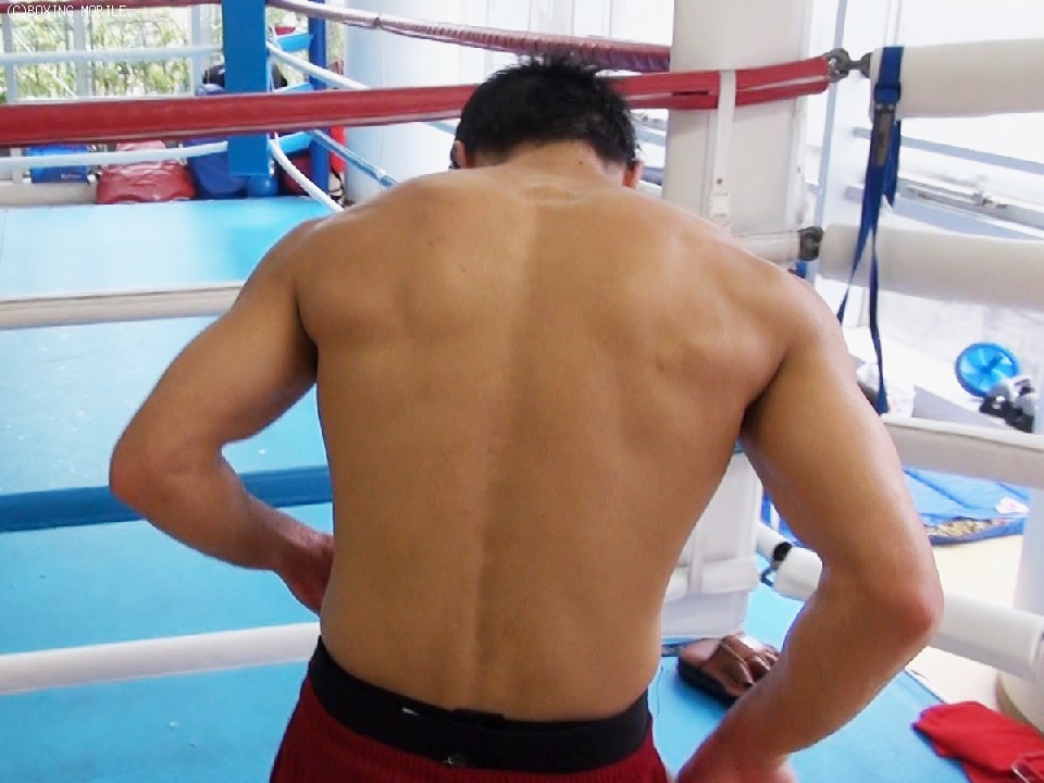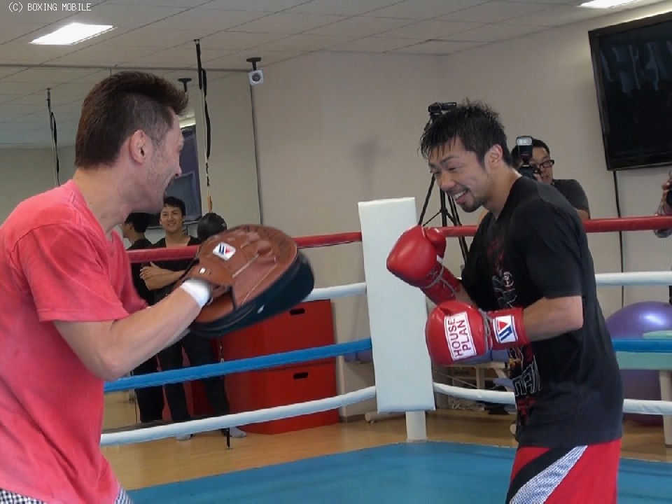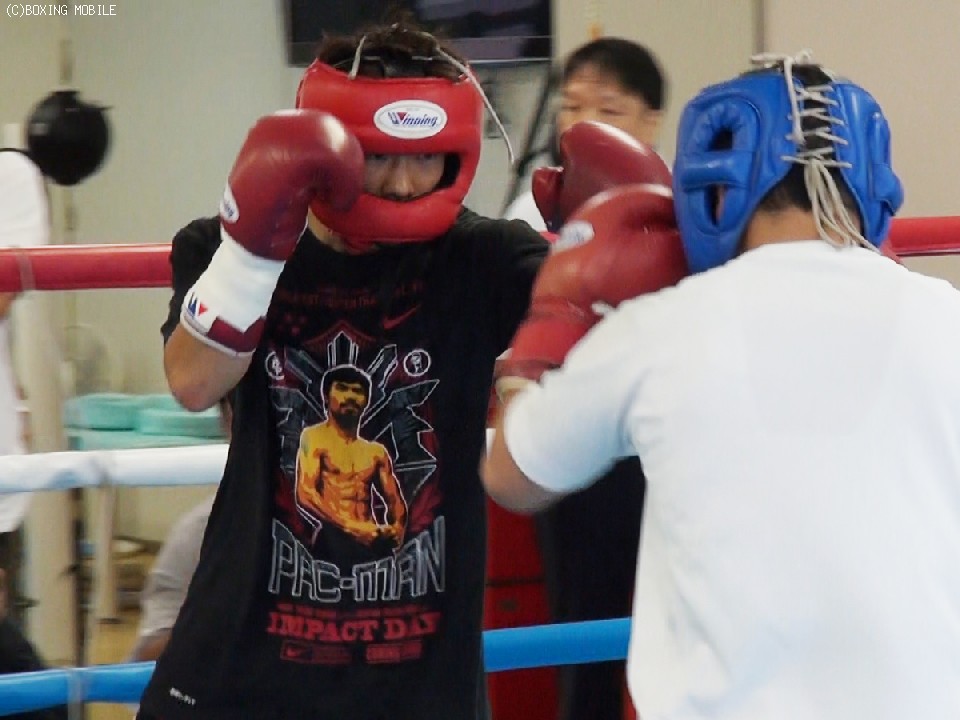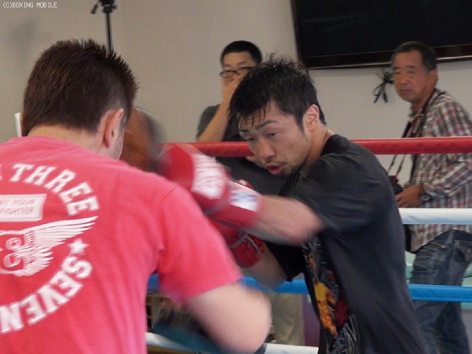今回の公開練習では、同門でOPBFミニマム級王者の原隆二と2ラウンドのスパーリング、バッグ打ち、ミット打ちを披露した。