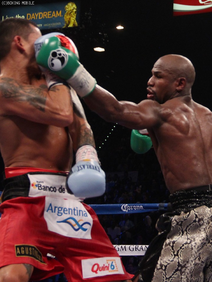 5回、今度はメイウェザーが自ら足を止めてプレッシャーをかけ返し、左ジャブから右ストレート、さらに左フックを見舞う。前のラウンドでマイダナに傾きかけた流れは再びメイウェザーが握ることになった。6回、マイダナは前進を再開したが、序盤よりも若干ながら間合いが空くことになった。マイダナは前に出て右を狙うが、これはメイウェザーも承知しておりクリーンヒットは許さない。逆にメイウェザーはカウンターをちらつかせて相手の前進を抑え、ボディにもパンチをヒット、優勢を印象づけた。8回、フラストレーションが極限に達したのかマイダナがメイウェザーの左グローブの親指部分に噛みつき、しばし試合は中断。インスペクターがメイウェザーのグローブを確認後、試合は続行された。
