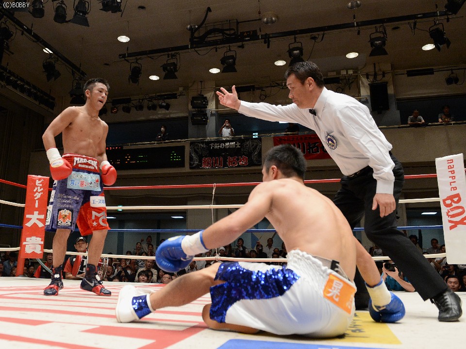 初回、相手の出方を探っていた両者だが、距離が近づくと粉川の左フックが先制ヒット。この一発で前に出始めた久高に対し、粉川は素早く後ろに一歩下がると左から右ストレートへと繋げる。2R、久高は完全に粉川の距離を潰しにかかりボディを効かせ、粉川が反撃に出れば一旦は距離を置くが、終了間際に右フックを浴びダウン。久高は以降、ジャブから徹底的にボディを攻め続け、4R終了間際にはボディからの連打で粉川をダウン寸前にまで追い込む。ここはロープに助けられた粉川だが、続く5Rも勢い付いた久高に苦戦。焦りからか攻撃も雑になる粉川。7Rも開始から久高が攻め込むが、粉川に反撃の隙を与えてしまう。最終8R、パンチを振り回す粉川にワンツーを返す久高だが、粉川も前に出続け、ラストまで意地の張り合いを見せた。判定はダウンを奪った粉川が逃げ切り、連敗を止めた。