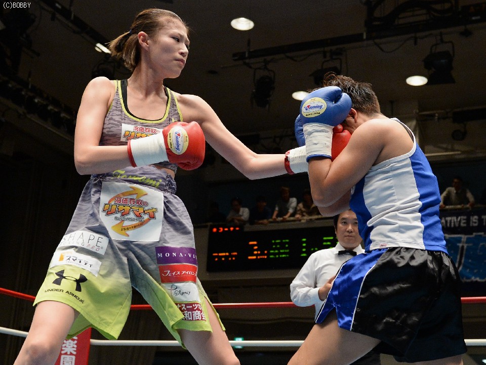 先日の計量に『アバター』の衣装で登場し、取材陣の注目を浴びた高野人母美(協栄)が15日、女子スーパーフライ級6回戦で、ドークマイパ・ソーデイントン(タイ)と対戦。今年6月にカイジョンソン(竹原&畑山)に敗れた高野は、今回が復帰戦でもあった。