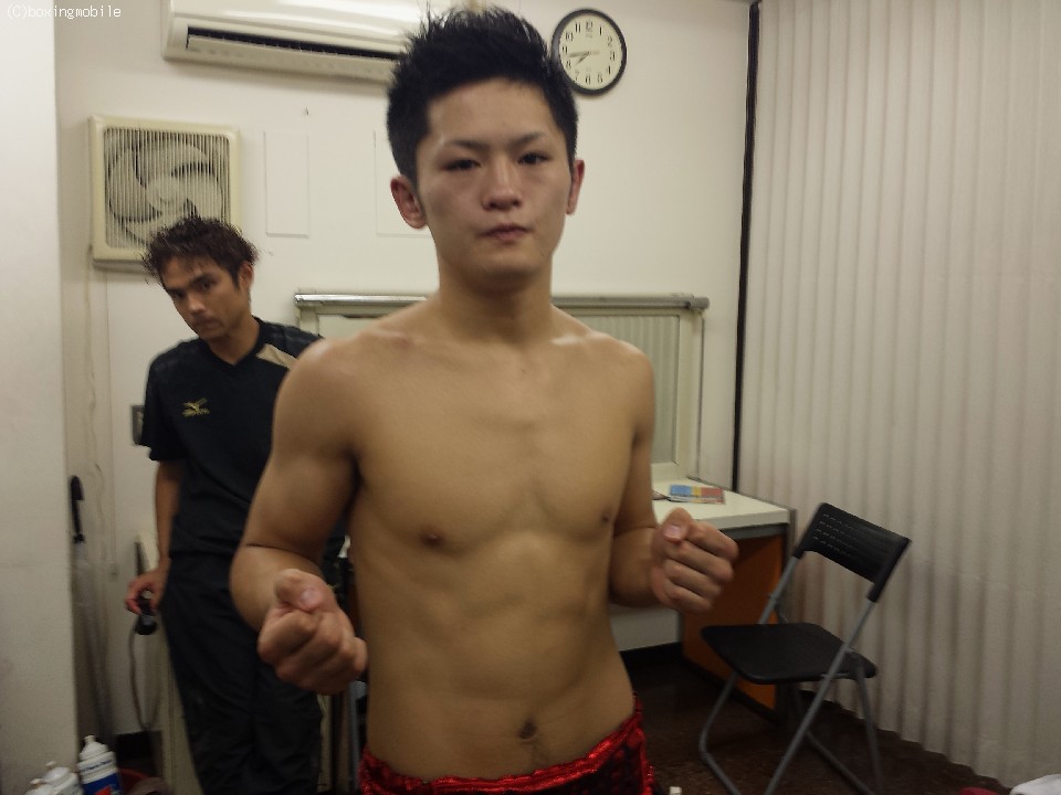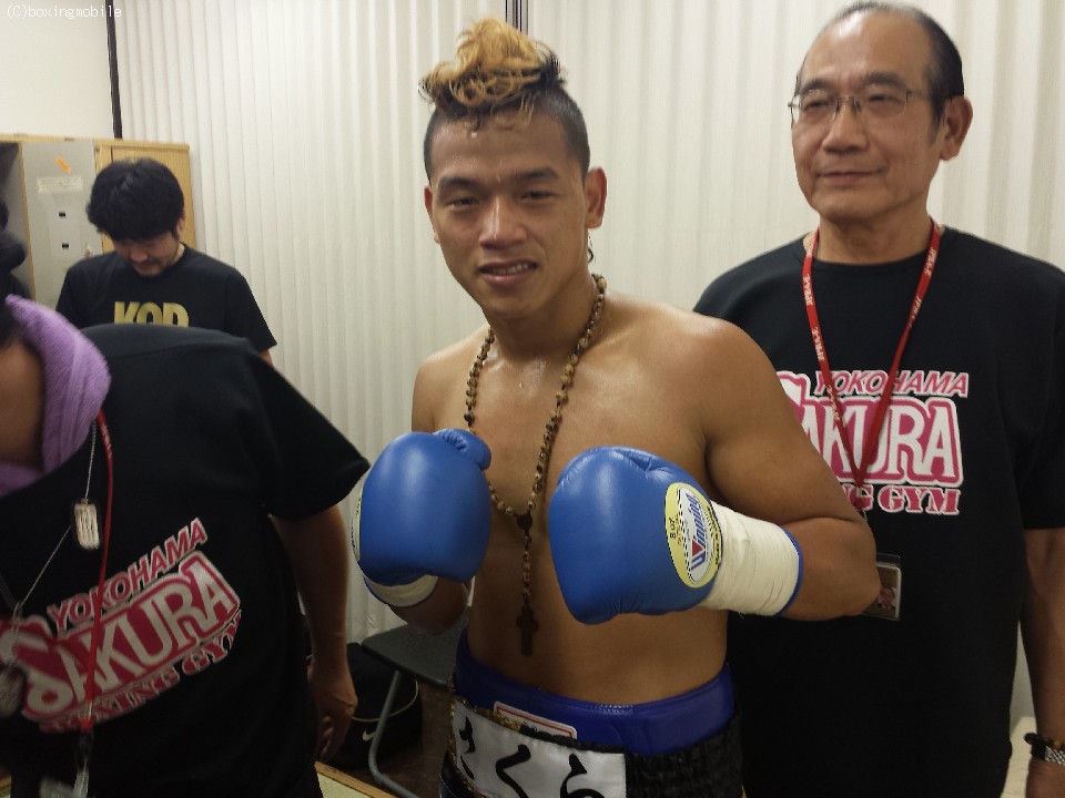 試合が始まり、応援合戦が始まる間もなく会場を大歓声に変えた、さくら淳。控室に戻り「1RでKOできて良かった」と笑顔を見せた。セコンド陣は「普段から、相手に打たせてからの展開で練習をしている。今回は練習通り」と明かし「ただ、早く終わってしまいやりたい事ができなかった」とも語った。さくら淳は今後、スーパーフェザー級で頂上を目指すという。