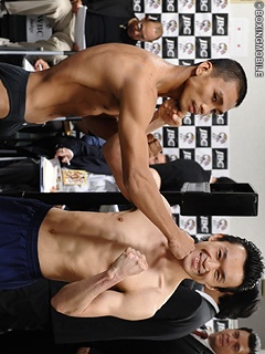 決戦を翌日に控えたバンタム級のWBC世界王者・長谷川穂積(真正)、WBO世界王者フェルナンド・モンティエル(メキシコ)の計量および、WBC世界スーパーバンタム級王者・西岡利晃(帝拳)と挑戦者同級11位バルウェグ・バンゴヤン(比)の計量が29日、後楽園ホールで行われた。