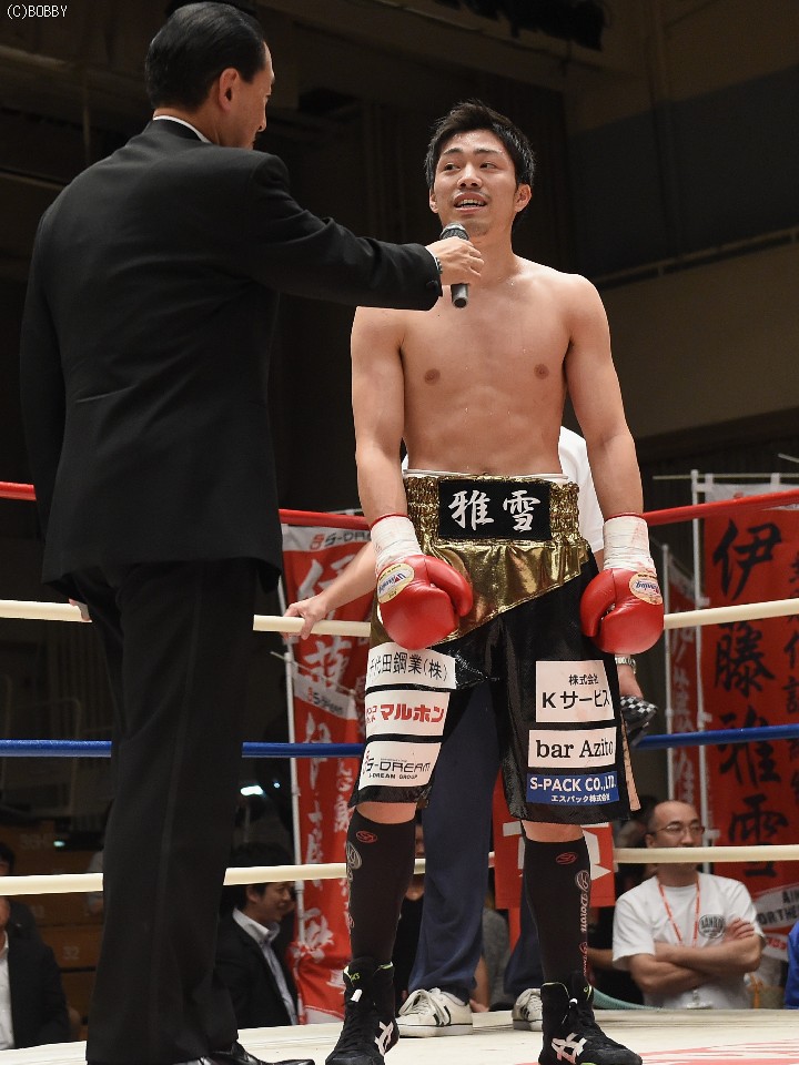 この勝利により、来年のチャンピオンカーニバルで日本スーパーフェザー級王者、内藤律樹(E&Jカシアス)への挑戦を内定させた伊藤は「どうしてもやりたかった相手。上を目指すなら避けては通れない。誰もが認める実力をつけて世界に行きたい」と意気込んだ。今回は内藤対策で左の実力者を選んだが、5戦目のサウスポーも問題なくクリア。「ジャブで試合を作り、右で決めることができた。もうちょっと続けたかったが、右アッパーが出せたのは収穫。内藤選手は今回のように簡単には当てさせてもらえないと思うが、日々の成長は実感している。これからさらに底上げして挑みたい」と話した。