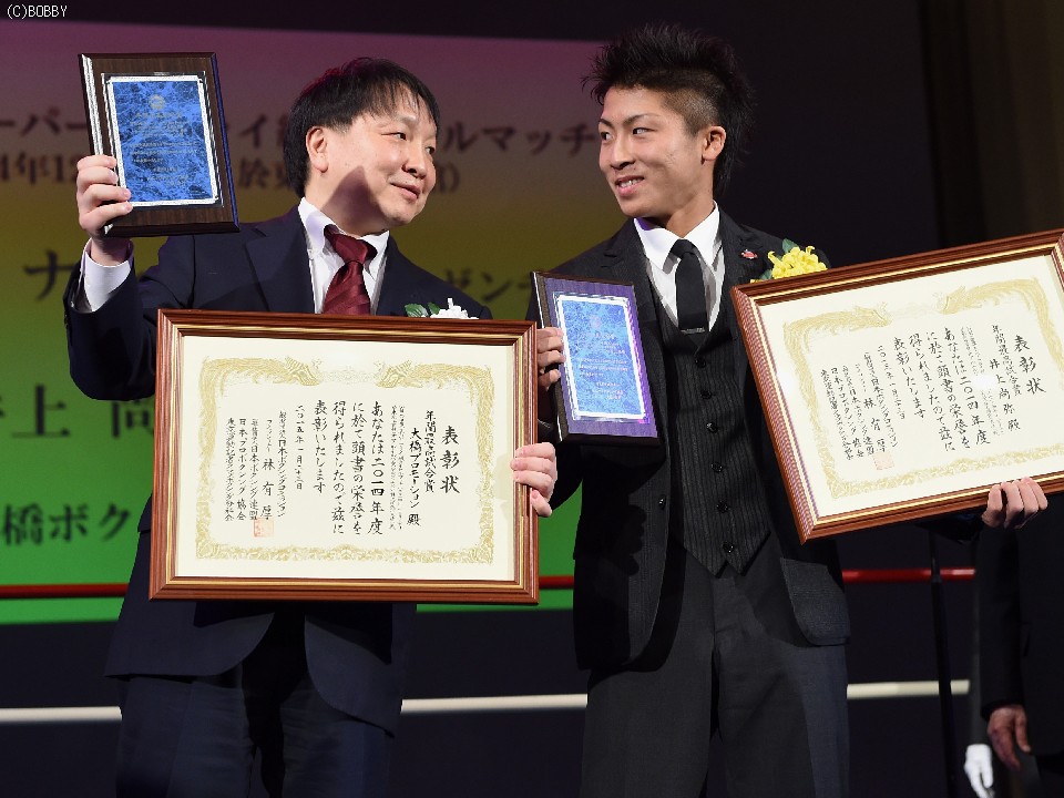 昨年は日本最短での世界奪取、そして年末のWBO世界スーパーフライ級王座挑戦で、世界王座を通算27度防衛したレジェンド、オマール・ナルバエス(アルゼンチン)を2回KOで破り、新時代の幕開けを高らかに告げた2階級制覇王者の井上尚弥(21=大橋)が、年間最優秀選手賞、KO賞、年間最高試合(ナルバエス戦)、そしてJBC(本ボクシングコミッション)サポーターズ・クラブ賞の4冠を獲得。さらにこの日、WBO(世界ボクシング機構)副会長からチャンピオンベルトが授与され、ボクシング界の主役の座を飾った。