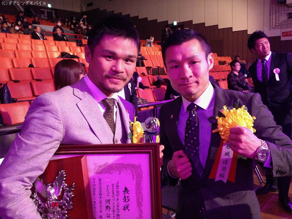 アマとプロの選手、関係者が一同に会したこの日の後楽園ホール。現在は近畿大学ボクシング部コーチとして、毎日選手と汗を流している名城信男氏とWBA世界スーパーフライ級王者、河野公平(ワタナベ)。かつては、このベルトを競い合った二人が再開。記念撮影に応じてくれた。