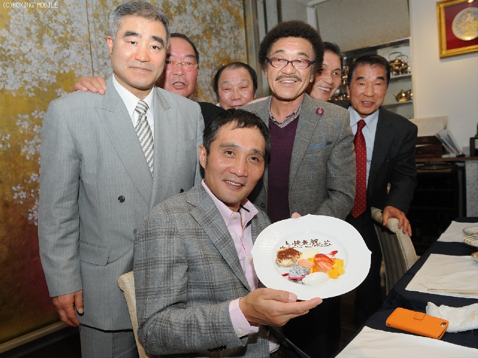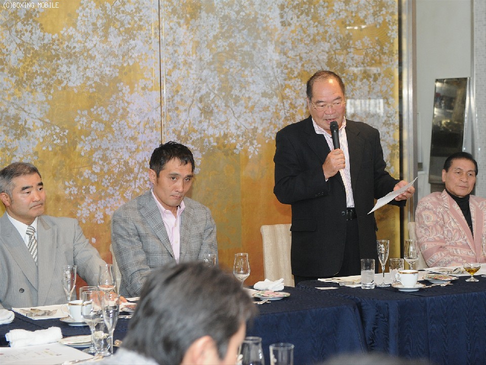 会には輪島功一氏、具志堅用高氏をはじめとする往年の世界王者、また内山高志(ワタナベ)、大橋ジムの八重樫東と井上尚弥、藤岡奈穂子(竹原&畑山)の現役選手ら20名が集結。開催の音頭をとったガッツ氏は「病魔をKOして戻ってきてくれた。まだ治療は続くと思うが不屈の闘志で頑張ってほしい」と竹原氏を激励し、現役代表としてマイクを握った内山も「辛く大変だったと思いますが、こうして集まることができて嬉しく思います」と喜んだ。
