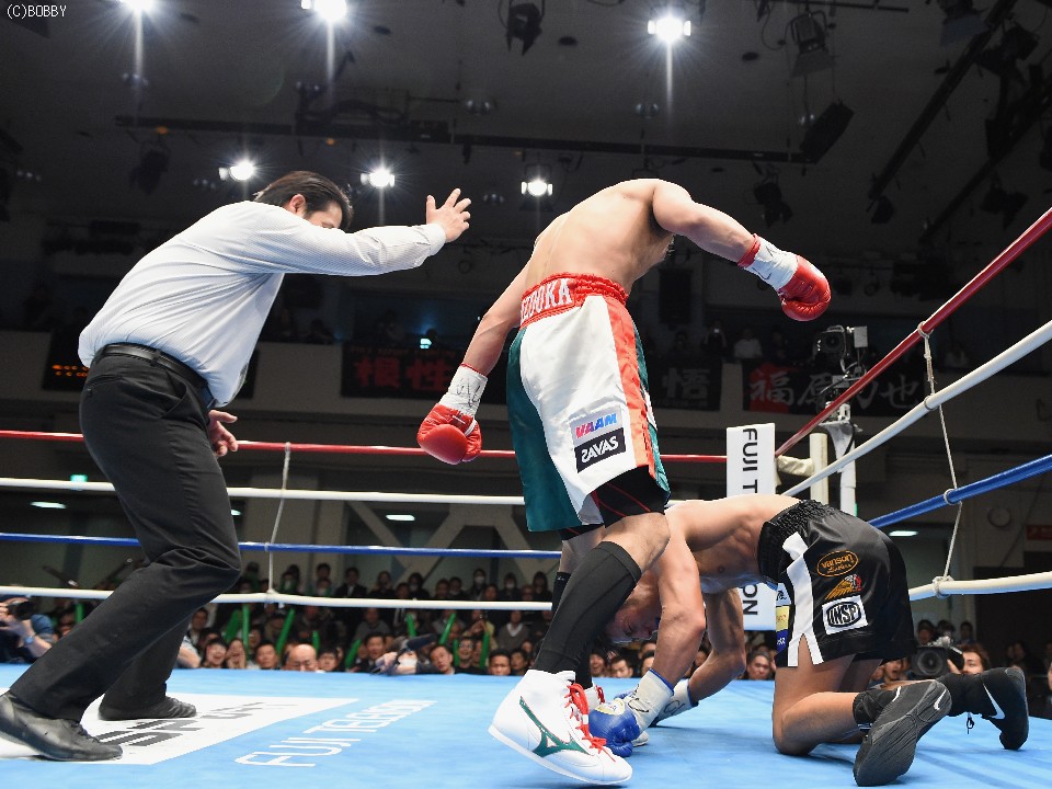 これまでで最高の400人の応援を背に、福原がキレのある動きを見せる。細野の圧力をスウェー、サイドへの移動でかわしては、立て続けに左右を繰り出し序盤のポイントを奪った。しかし、細野が3回にプレスを強めると、4回に強烈な左フックを浴びピンチ。逃げ切れずに左ボディを決められ、ダウンを奪われた。