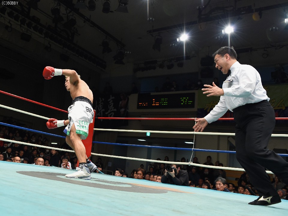続く第4試合では、日本スーパーバンタム級6位の久永志則(29=角海老宝石)に挑戦した高橋拓海(33=マナベ)が、長身から繰り出した右で2回にダウンを奪い、最後は連打でストップ勝ち。初のランキング奪取をはたした。