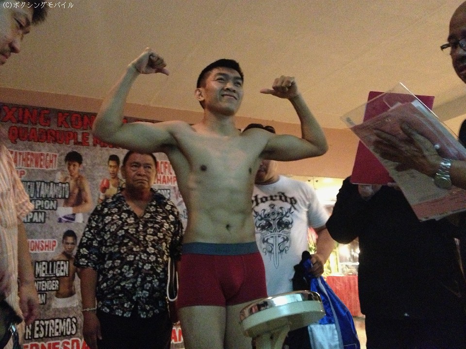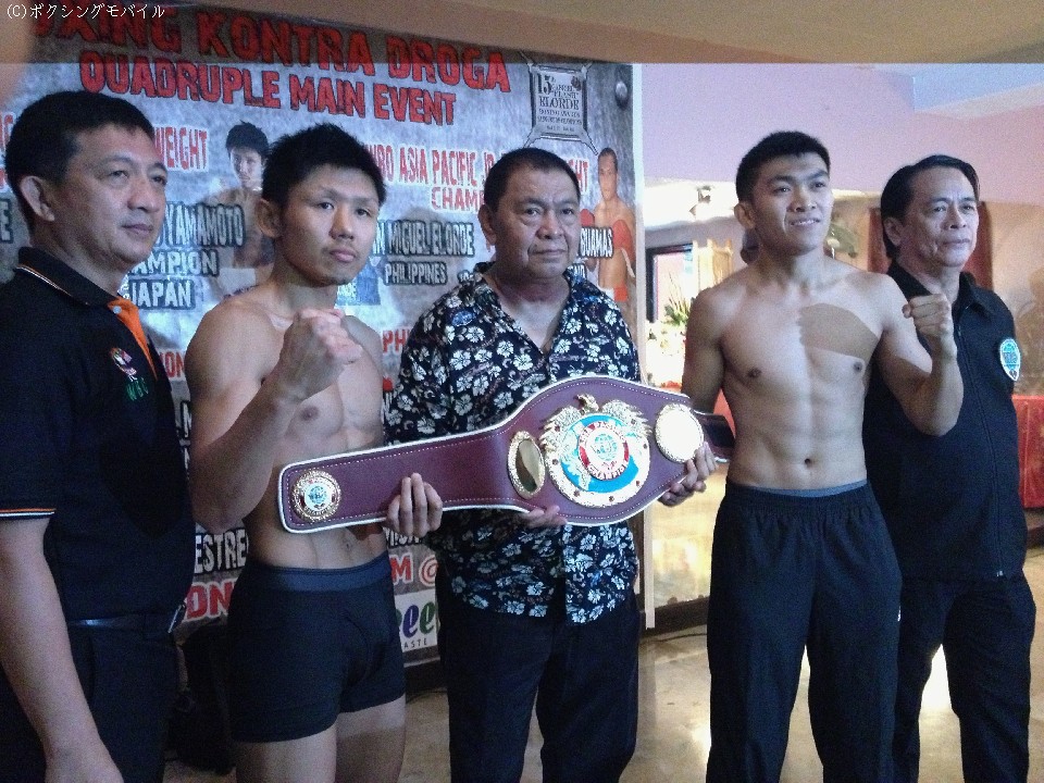 WBOアジアパシフィックSフェザー級タイトルマッチの前日計量が24日、フィリピンのパラニャーケにあるエロルデセンターで行われた。チャンピオンでWBO世界同級7位のファン・マーチン・エロルデ(比) と元日本同級ランカー山元浩嗣(ワタナベ)は現地時間の午前10時の計量開始に合わせて会場入りした。