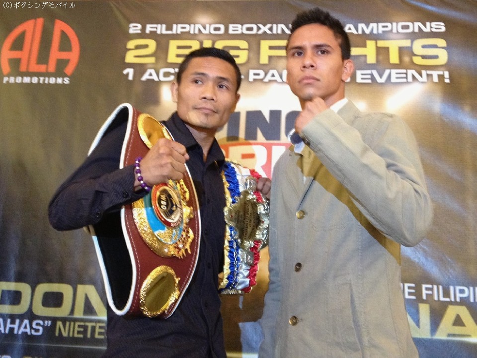 フィリピンのスーパースター、世界五階級制覇王者ノニト・ドネアと同じく二階級王者のドニー・ニエテスが26日、マニラ市内のソレイルホテルで合同会見を開いた。