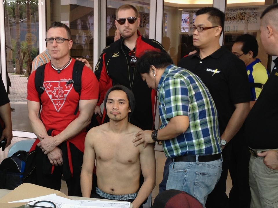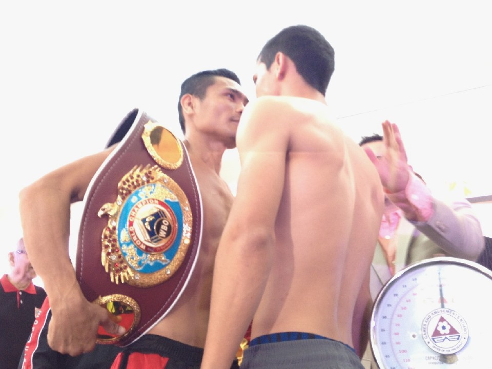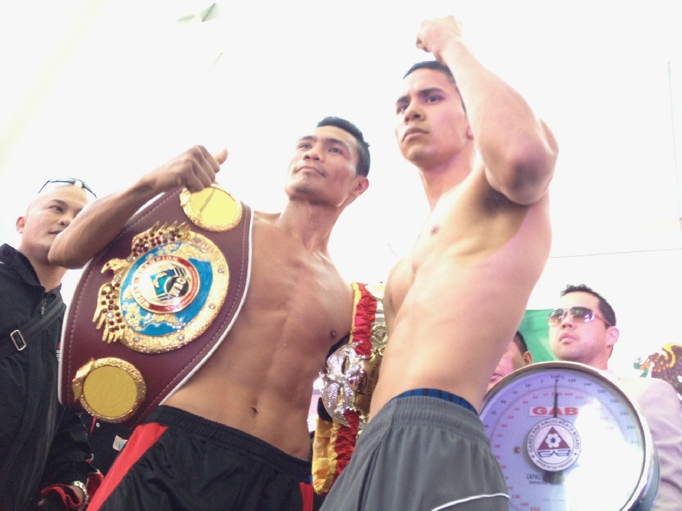 メインイベントのリングに上がるWBO世界ライトフライ級王者のドニー・ニエテス(比)と挑戦者のヒルベルト・パーラー(メキシコ)。両者ともにリミットの108lbで一発クリアした。