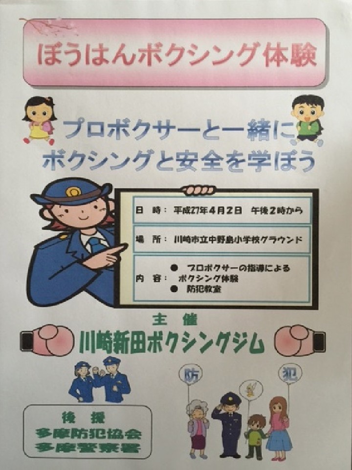 地域密着を掲げ、「防犯ロードワーク」を全国に先駆けて実施した神奈川・川崎新田ジムが、その発展版として多摩防犯協会・多摩警察署の協力の下、「ぼうはんボクシング体験(ボクシング体験教室、防犯教室)」を行うことになった。
